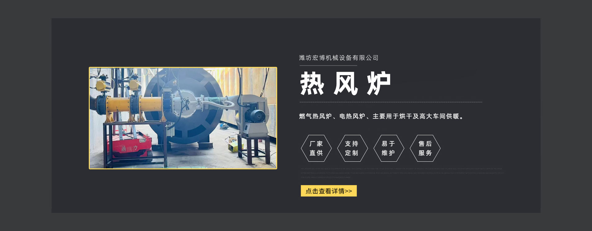 濰坊宏博機械設(shè)備有限公司是從事熱風(fēng)爐、烘干設(shè)備、供暖設(shè)備的研發(fā)、設(shè)計、制造和服務(wù)于一體的實體企業(yè)。長期以來,企業(yè)以市場的發(fā)展和客戶的需求為導(dǎo)向,集多年的生產(chǎn)技術(shù)與經(jīng)驗為一體,不斷開發(fā)和優(yōu)良產(chǎn)品。